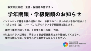 敦賀気比高校 第1回入試説明会(11/29土曜午前8:45受付~11:40)申込みが開始されました。今年の入試では特進コースの併願枠導入など、入試改革についてもご説明します。是非、ご来校ください!お申し込みは敦賀気比高校ホームページ「受験生の方へ」から!