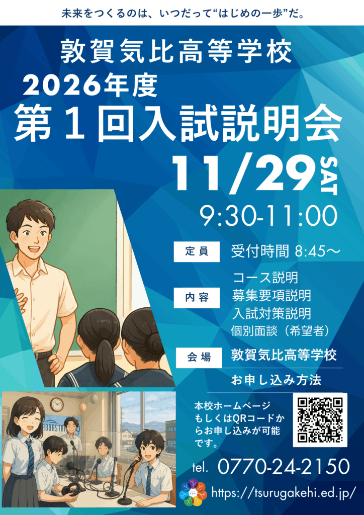 敦賀気比高校 第1回入試説明会〔11月29日(土)午前8:45受付10:00開始〕の申込み受付が、いよいよ10月15日(水)15:55からスタートします。ホームページからお申し込みください。