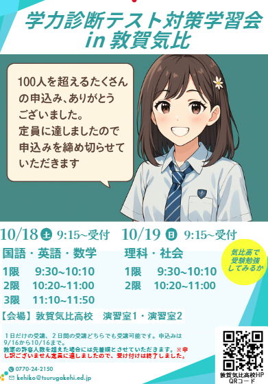 学力診断テスト対策学習会in敦賀気比高校を10月18日、19日に今年も開催します。高校受験を控えた中学3年生の皆さん、是非参加してください。
