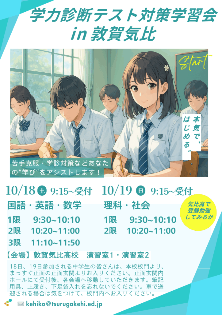 18日〔土〕、19日〔日〕学診対策学習会に参加予定の中学生の皆さんへ