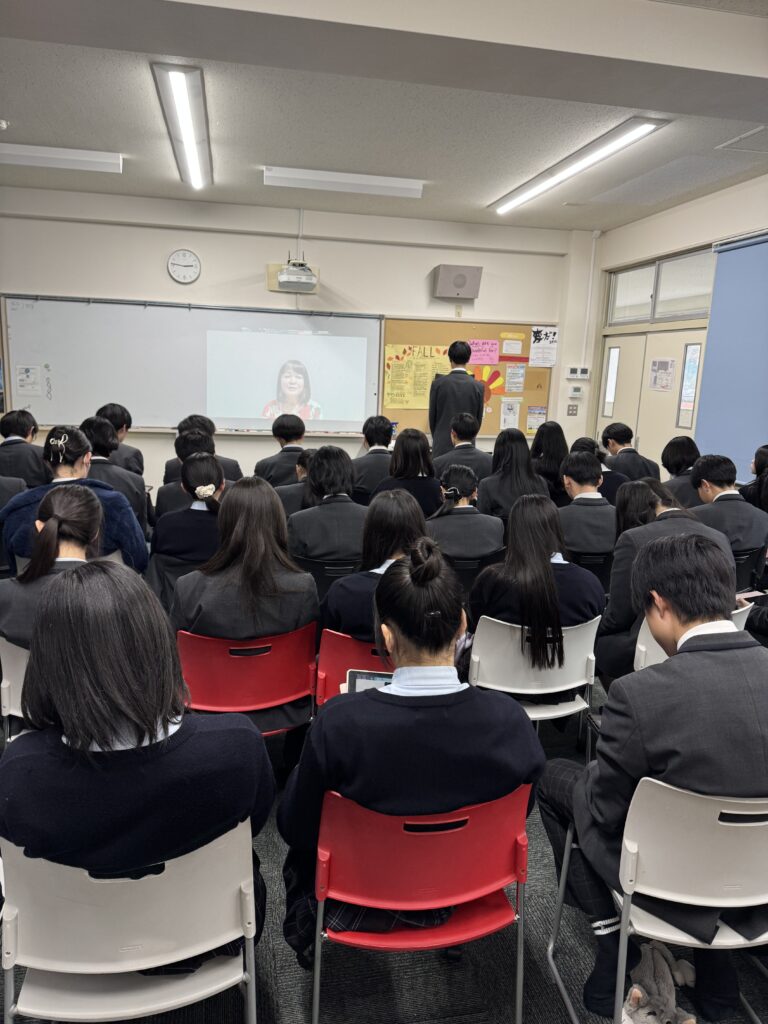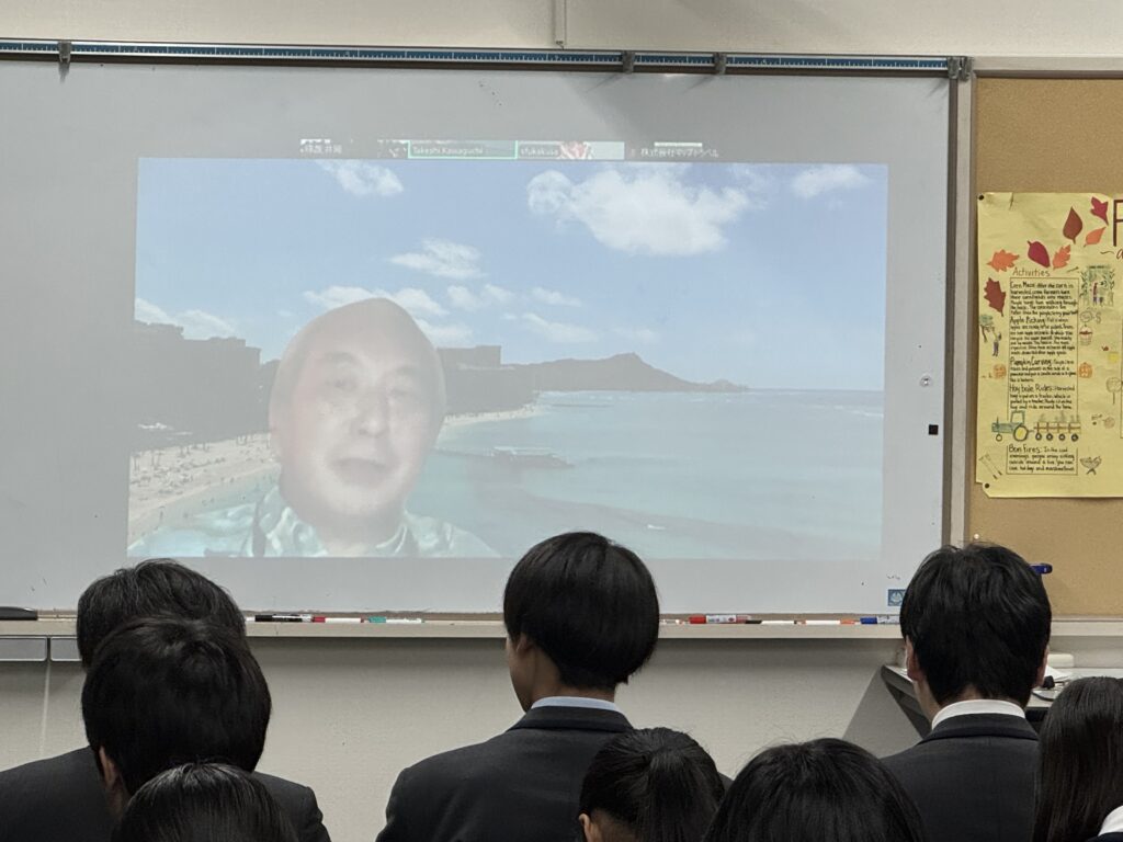 ハワイにおられる福井県人会の方々から、ハワイへ渡られた経緯や、ハワイの良さ、ワイキキビーチの素晴らしさ、ダイヤモンドヘッドの魅力などを教えていただきました。また、日本と違って、行列に並ぶときは、前の人と距離を詰めすぎず、ある程度の間隔をとって並ぶこと。物価が高いから、スパムおにぎりなど、工夫することの大切さなども教えていただきました。生徒たちも大変参考になったようです。